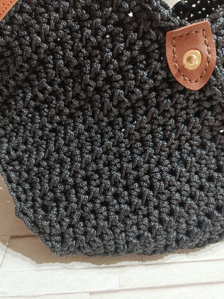 BOLSO A GANCHILLO HECHO CON HILO TEJIDO NEGRO GRUESO, CON ASAS PARA LLEVARLO EN LA MANO O AL HOMBRO.